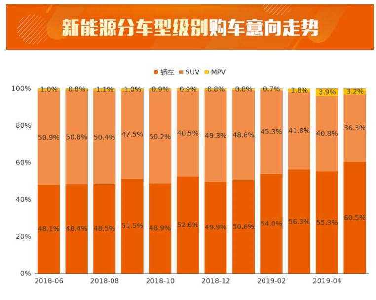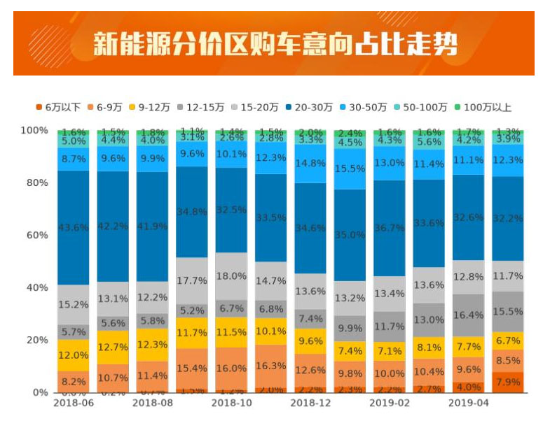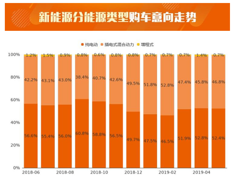 2019年5月,新能源車(chē)中純電動(dòng)車(chē)型用戶(hù)購(gòu)車(chē)意向數(shù)量占比為52.4%,相較上月小幅下跌0.4個(gè)百分點(diǎn),購(gòu)車(chē)意向占比見(jiàn)頂回落;插電式混合動(dòng)力車(chē)型用戶(hù)購(gòu)車(chē)意向占比為46.8%,與上月相比小幅上漲1.0個(gè)百分點(diǎn),用戶(hù)購(gòu)車(chē)意向占比經(jīng)歷連續(xù)下滑后開(kāi)始反彈;增程式車(chē)型用戶(hù)購(gòu)車(chē)意向占比僅為0.7%。整體來(lái)看,插電式混合動(dòng)力車(chē)型用戶(hù)購(gòu)車(chē)意向數(shù)量迎來(lái)了持續(xù)擴(kuò)張,它可以享受新能源的優(yōu)惠政策,又不像純電動(dòng)車(chē)型一般具有里程焦慮、充電困難等瓶頸。同時(shí),隨著產(chǎn)品技術(shù)的提升,插電式混動(dòng)車(chē)型的成本也有了較好的控制。隨著新能源車(chē)補(bǔ)貼逐漸退坡直至退出,新能源市場(chǎng)由政策驅(qū)動(dòng)向市場(chǎng)驅(qū)動(dòng)變軌后,插電式混動(dòng)車(chē)型或會(huì)強(qiáng)化在私人領(lǐng)域的優(yōu)勢(shì)。