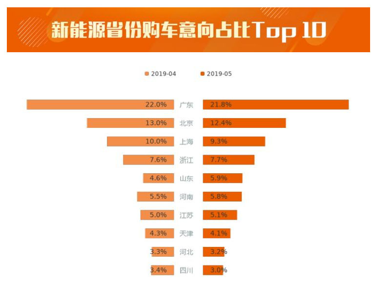 2019年5月,用戶(hù)購(gòu)車(chē)意向占比最高的5個(gè)省份包括廣東、北京、上海、浙江、山東,廣東以21.8%的用戶(hù)購(gòu)車(chē)意向占比獨(dú)居鰲頭,大幅甩開(kāi)其他省份。線索量Top 10省份用戶(hù)購(gòu)車(chē)意向占比累計(jì)達(dá)78.3%,相較上月降低0.4個(gè)百分點(diǎn),市場(chǎng)區(qū)域集中度有所下降。全部省份中有13個(gè)省份用戶(hù)購(gòu)車(chē)意向占比有所增加,而11個(gè)省份的用戶(hù)購(gòu)車(chē)意向占比出現(xiàn)下滑,其中,山東、河南、安徽相較上月購(gòu)車(chē)意向占比分別增加1.3%、0.3%、0.2%,為增長(zhǎng)最高的3個(gè)省份;上海、北京、四川用戶(hù)購(gòu)車(chē)意向占比分別減少0.7%、0.6%、0.4%,為下降最多的3個(gè)省份。