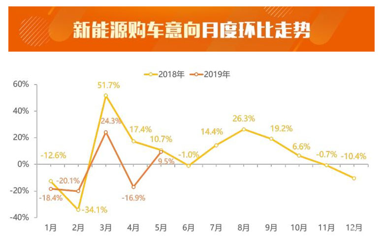 首先,我們來(lái)看一下新能源汽車(chē)整體走勢(shì)如何。5月,新能源車(chē)用戶(hù)購(gòu)車(chē)意向數(shù)量環(huán)比增長(zhǎng)9.5%,相較上月環(huán)比增長(zhǎng)率提高26.4個(gè)百分點(diǎn),用戶(hù)購(gòu)車(chē)意向經(jīng)歷下滑后,開(kāi)始回升。汽車(chē)市場(chǎng)具有明顯的季節(jié)性和周期性,我們將今年的購(gòu)車(chē)意向數(shù)據(jù)與上一年的數(shù)據(jù)對(duì)比來(lái)看,今年5月與上一年同期相比,上漲走勢(shì)有所放緩。去年3至5月環(huán)比均為增長(zhǎng)走勢(shì),但增幅逐月縮窄;今年4月份,受補(bǔ)貼退坡影響,用戶(hù)購(gòu)車(chē)意向環(huán)比大幅下滑,而隨著政策過(guò)渡期的即將結(jié)束及廠商促銷(xiāo)政策的推出,5月份購(gòu)車(chē)熱度開(kāi)始反彈。