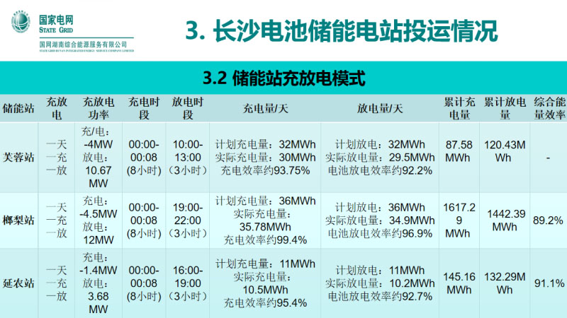 這張表是儲(chǔ)能電站的充放電模式,芙蓉站因?yàn)樗?月10號(hào)之后才正式交界投運(yùn)的,所以它的綜合效率數(shù)據(jù)意義不大。三個(gè)站都是一天一充一放,但都不是滿充滿放的狀態(tài)。榔梨站運(yùn)行的時(shí)間比較長(zhǎng),充放電達(dá)到了一千多兆瓦。延農(nóng)站是6月初正式投運(yùn),大概運(yùn)行了十多天。綜合能量效率都比較高,將近90%左右。