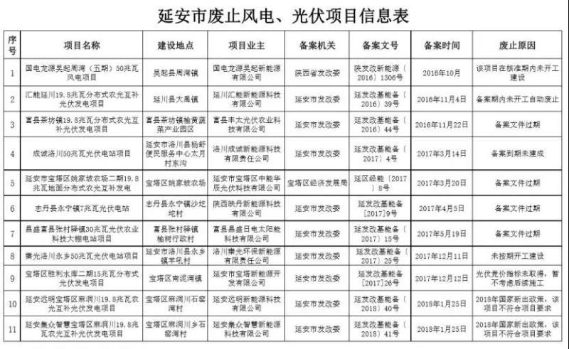 6月21日,陜西省延安市發(fā)改委發(fā)布《關(guān)于廢止一批風(fēng)電、光伏項(xiàng)目的公示》,在梳理了該市風(fēng)電、光伏已核準(zhǔn)(備案)項(xiàng)目建設(shè)情況后,清理一批在核準(zhǔn)和備案期限內(nèi)未開工建設(shè)或企業(yè)自愿放棄建設(shè)的項(xiàng)目,包括風(fēng)電項(xiàng)目1個(gè),總規(guī)模50MW;光伏發(fā)電項(xiàng)目10個(gè),總規(guī)模251MW。廢止原因包括備案期內(nèi)未開工、備案文件過期、未取得光伏競(jìng)價(jià)指標(biāo)暫不考慮后續(xù)施工、不符合2018年國家新政項(xiàng)目要求等。