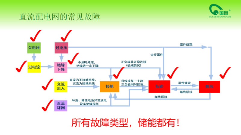 這是我們直流側(cè)常見的故障類型,大家看看日常分析,短路和過流經(jīng)常是我們重點(diǎn)分析的,事實(shí)上我們還有其他很多的故障現(xiàn)象,比如說欠電壓、過電壓,韓國(guó)的事故里面,過電壓從交流側(cè)PCS過來的。還有絕緣和接地,絕緣下降和接地是我們最常見的故障形式之一,所以我們必須要在直流側(cè)裝一個(gè)接低保戶,剛才說的阻抗式的保護(hù)在我們直流側(cè)只能有一套同時(shí)工作,那就可能出問題。