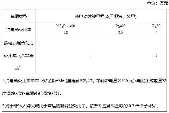 2、純電動乘用車工況續(xù)駛里程不低于250 km。插電式混合動力乘用車(含增程式)工況法續(xù)駛里程不低于50 km。(純電動乘用車工況續(xù)駛里程不低于150 km。插電式混合動力(含增程式)乘用車工況法續(xù)駛里程不低于50 km。)(2018年補(bǔ)貼技術(shù)要求)