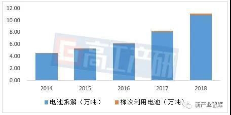 2)對無梯次利用價值的電池進行拆解,回收其中的鎳、鈷、錳、鋰等材料,如數(shù)碼類電池、部分三元材料類電池。GGII調研顯示,2018年動力電池回收總量中用于梯次利用的電池量為2460噸,總回收拆解的電池量為10.93萬噸,電池回收領域尤其是動力電池回收領域,用于梯次利用的規(guī)模遠低于回收拆解的規(guī)模。