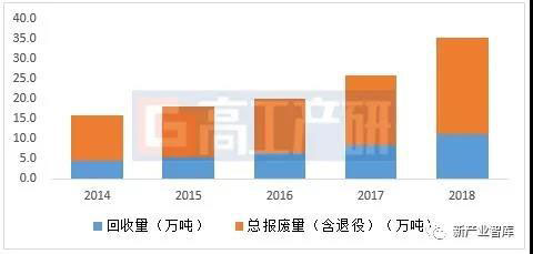 2014-2018年廢舊電池回收量及總報廢量(單位:萬噸)