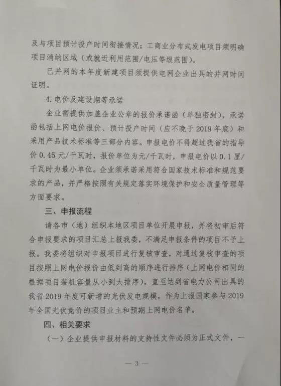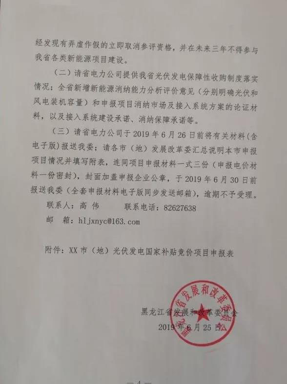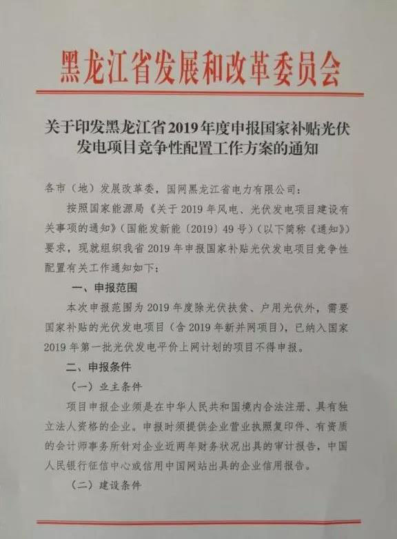 6月25日,黑龍江省發(fā)改委發(fā)布《關(guān)于印發(fā)黑龍江省2019年度申報國家補貼光伏發(fā)電項目競爭性配置工作方案的通知》,要求省電力公司于2019年6月26日前將黑龍江省光伏發(fā)電保障性收購制度落實情況、全省新增新能源消納能力分析評價意見(分別明確光伏和風電裝機容量)和申報項目消納市場及接入系統(tǒng)方案的論證材料,以及接入系統(tǒng)建設(shè)承諾、消納保障承諾等有關(guān)材料(含電子版)報送至省發(fā)改委;市(地)發(fā)改委匯總說明本市申報項目情況并填寫附表,連同項目申報材料一式三份(申報電價材料一份密封),封面加蓋申報企業(yè)公章,于2019年6月30日前報送至省發(fā)改委(全套申報材料電子版同步發(fā)送郵箱)。
