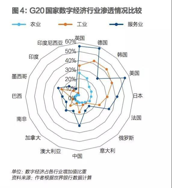 發(fā)展特色方面,各國數(shù)字經(jīng)濟(jì)行業(yè)發(fā)展各具特色。受到資源稟賦及產(chǎn)業(yè)發(fā)展基礎(chǔ)影響,G20國家數(shù)字經(jīng)濟(jì)行業(yè)比較優(yōu)勢存在差異。其中,英國、德國、美國三大產(chǎn)業(yè)數(shù)字經(jīng)濟(jì)滲透率均領(lǐng)先于其他國家,數(shù)字經(jīng)濟(jì)發(fā)展水平最高且行業(yè)發(fā)展平衡。以德國為例,德國各行業(yè)數(shù)字經(jīng)濟(jì)均衡發(fā)展,2017年農(nóng)業(yè)、工業(yè)、服務(wù)業(yè)數(shù)字經(jīng)濟(jì)滲透率分別達(dá)到22.1%、43.1%和58.2%,其中,服務(wù)業(yè)中的研發(fā)、金融等,工業(yè)中的電子設(shè)備制造等,數(shù)字經(jīng)濟(jì)滲透率均超過59%,服務(wù)業(yè)中的教育、運(yùn)輸倉儲等,工業(yè)中的機(jī)器設(shè)備、采掘等,數(shù)字經(jīng)濟(jì)滲透率也都超過30%。韓國與墨西哥的數(shù)字經(jīng)濟(jì)在工業(yè)中滲透率排名顯著高于農(nóng)業(yè)與服務(wù)業(yè)排名,屬于工業(yè)數(shù)字經(jīng)濟(jì)優(yōu)先發(fā)展國家。中國、日本、法國數(shù)字經(jīng)濟(jì)在服務(wù)業(yè)的發(fā)展水平快于農(nóng)業(yè)與工業(yè)的發(fā)展水平,屬于服務(wù)業(yè)優(yōu)先發(fā)展的國家。如,2017年日本服務(wù)業(yè)中研發(fā)及其他商業(yè)活動、金融、公共管理和社會保障數(shù)字經(jīng)濟(jì)滲透率分別高達(dá)78.1%、65.8%和48.9%,而工業(yè)中數(shù)字經(jīng)濟(jì)發(fā)展相對較快的電子設(shè)備制造、機(jī)器設(shè)備制造、汽車制造數(shù)字經(jīng)濟(jì)滲透率僅分別為41.4%、32.5%和18.4%。俄羅斯、澳大利亞、南非等國家的數(shù)字經(jīng)濟(jì)在農(nóng)業(yè)中的滲透率排名高于工業(yè)與服務(wù)業(yè),屬于農(nóng)業(yè)數(shù)字經(jīng)濟(jì)發(fā)展較快的國家。