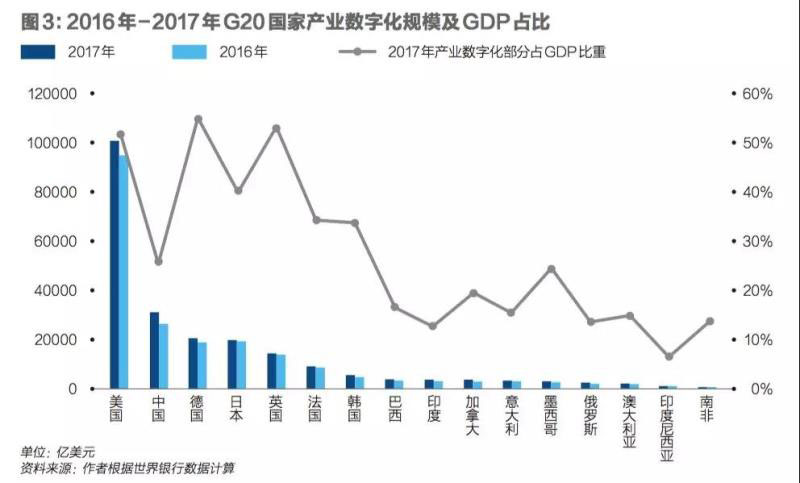 伴隨數(shù)字技術(shù)向傳統(tǒng)產(chǎn)業(yè)融合滲透不斷深化,呈現(xiàn)出數(shù)字產(chǎn)業(yè)化占數(shù)字經(jīng)濟(jì)的比重逐步減少,產(chǎn)業(yè)數(shù)字化占數(shù)字經(jīng)濟(jì)比重相應(yīng)上升的發(fā)展態(tài)勢。G20國家數(shù)字經(jīng)濟(jì)結(jié)構(gòu)中產(chǎn)業(yè)數(shù)字化部分的比重由2016年的84.18%提高到2017年的84.47%,數(shù)字產(chǎn)業(yè)化部分比重相應(yīng)地由15.82%降低到15.53%。反映了全球數(shù)字經(jīng)濟(jì)正逐步向ICT產(chǎn)業(yè)與傳統(tǒng)產(chǎn)業(yè)深度融合發(fā)展的方向邁進(jìn),行業(yè)間的跨界融合與垂直整合將進(jìn)一步影響數(shù)字經(jīng)濟(jì)的產(chǎn)業(yè)發(fā)展格局。