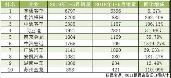有人歡喜,自然就有人愁。比亞迪、廈門金旅、廈門金龍、湖南中車等排名退步,其中比亞迪累計銷量1921輛出現(xiàn)了超3成的降幅,排名也由2018年同期的第2降至第4。需要強調(diào)的是,金龍汽車旗下“兩龍”廈門金旅、廈門金龍更是直接掉榜單前10,要知道它們2018年同期分別位列第3、第4,前5月累計銷量分別僅有652輛、654輛。