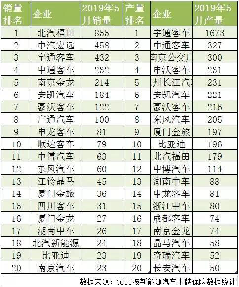 北汽福田、中通客車、南京金龍、中汽宏遠(yuǎn)、廣通汽車等車企表現(xiàn)均不錯,較去年同期排名均有提升。北汽福田由去年同期第9名躍升至第二,前5月累計銷量3200輛,實現(xiàn)了超2.6倍的快速增長;中汽宏遠(yuǎn)也較去年上升了9個名次,今年以1765輛的累計銷量位列第6名,并實現(xiàn)了超15倍的超高增長率。