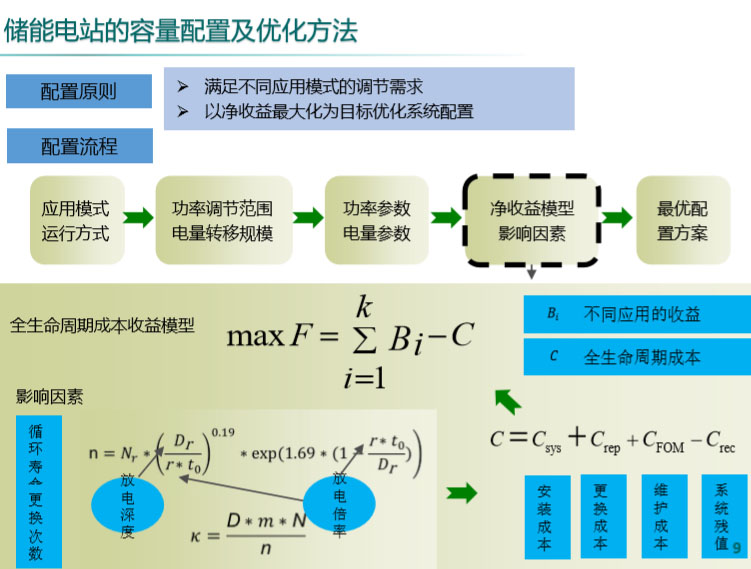 第一個(gè)方面是配置,對(duì)于它的應(yīng)用模式這邊來進(jìn)行原則。第一,滿足不同應(yīng)用模式的調(diào)節(jié)需求,第二,滿足不同方式的全生命周期成本收益,分析儲(chǔ)能的放電、充電倍率,以及放電深度對(duì)儲(chǔ)能壽命的影響,提出儲(chǔ)能在電網(wǎng)中容量配置的優(yōu)化模型。