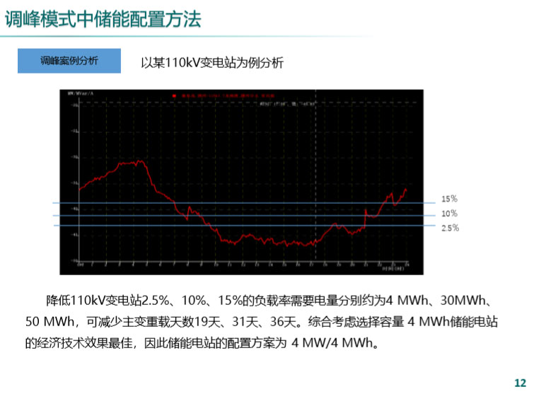 儲(chǔ)能技術(shù)的應(yīng)用于調(diào)控模式主要是包括功率配置還有容量配置,對(duì)于儲(chǔ)能的功率我們一般都采用了儲(chǔ)能電站的最大出力,儲(chǔ)能電站以及連續(xù)電量,以及最大尖峰電量的最大值來做的。舉個(gè)例子來說,這是某某變電站的負(fù)荷曲線,110主變負(fù)載率是屬于重載的模式,這種情況對(duì)于主變重載的擴(kuò)容,第一這個(gè)站因?yàn)樗恢帽容^特殊,基本沒有線路走廊,通過這樣我們可以建儲(chǔ)能來給它削峰填谷,第一可以延緩它增容的時(shí)間,第二在案例分析上面我們可以結(jié)合時(shí)間效益和社會(huì)效益,如果說我新建儲(chǔ)能我是不用新建一個(gè)長(zhǎng)距離的線路走廊的,包括費(fèi)用都是可以做一個(gè)相關(guān)的經(jīng)濟(jì)比較的。