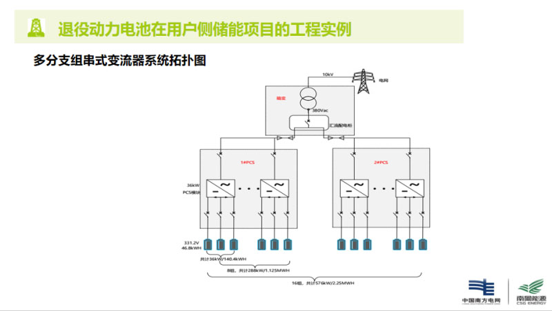 這是系統(tǒng)的拓撲圖,一個逆變器控制三個簇,一簇大概是46.8千瓦時,這是我們對退役電池的經濟性比較,和新電池比較,因為退役電池中間肯定要換,要么去重新替換,可能有時候是完全替換,我們預算大概要換兩次,它的剩余的循環(huán)壽命大概2000到3000次,我們計算了一下,大概是7%的收益,但是應該性比全新的目前還是稍差,因為它的后期運維還有性能的不確定性很難去判斷,但是全新電池基本上可以讓電池廠家進行保證。我們認為退役電池還有很長的路需要走,目前來看退役電池的量還不是很大,退役的規(guī)模、回收這個通路還沒有打通。