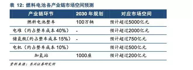 國內(nèi)2030年燃料電池汽車商業(yè)推廣計劃超過100萬輛,預(yù)計對應(yīng)市場空間超過5000億元。按照電堆成本占比40%,儲氫瓶成本占比15%,電機成本占比10%計算,預(yù)計2030年國內(nèi)燃料電池電堆、儲氫瓶、電機對應(yīng)市場空間分別超過2000億元、750億元和500億元。