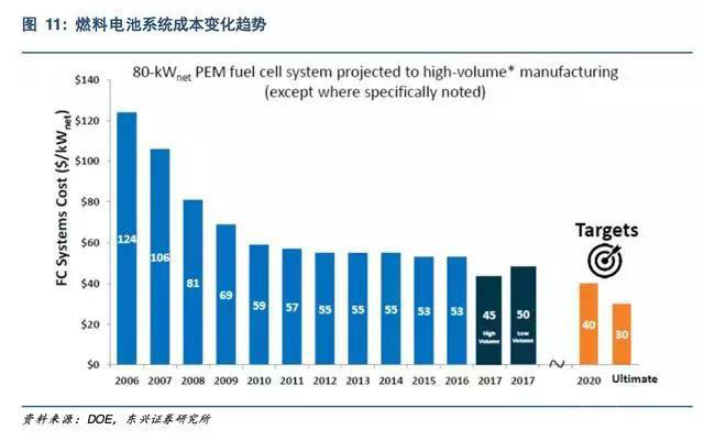 從成本端來看,國外燃料電池系統(tǒng)規(guī)模化成本已經(jīng)降至45美元/kW,接近40美元/kW的戰(zhàn)略目標(biāo),根據(jù)DOE的規(guī)劃,到2020年燃料電池系統(tǒng)成本降至40美元/kW以下,最終商用需要成本降至30美元/kW左右。此外,新一代的燃料電池發(fā)動機100kW鉑用量小于10g,基本達到內(nèi)燃機排放后處理鉑用量水平。