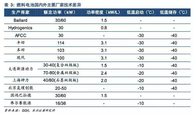 豐田Mirai的燃料電池電堆功率密度已經(jīng)達到3.1kW/L,較2008年的1.4kW/L提升了一倍。此外,國內(nèi)車用燃料電池系統(tǒng)功率密度也已經(jīng)達到2.0kW/L,并掌握了-10°C低溫啟動技術(shù)。