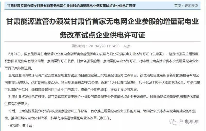 這是甘肅省頒發(fā)的第二家增量配電業(yè)務(wù)許可證,新奧金能是北京新奧新能能源投資有限公司主導(dǎo)投資80%、政府參股投資20%設(shè)立的。而北京新奧新能能源投資有限公司的主營業(yè)務(wù)是項目投資;銷售機械設(shè)備;節(jié)能、分布式能源及其他能源利用技術(shù)開發(fā)、技術(shù)咨詢、技術(shù)轉(zhuǎn)讓、技術(shù)推廣服務(wù);合同能源管理;新能源研發(fā);施工總承包;專業(yè)承包;工程勘察設(shè)計;經(jīng)濟信息咨詢(不含中介服務(wù));軟件開發(fā);租賃建筑工程機械設(shè)備;燃氣經(jīng)營;電力供應(yīng)。并沒有擁有電網(wǎng)呢。