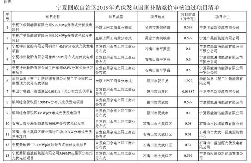 7月2日,寧夏發(fā)改委發(fā)布《關(guān)于全區(qū)2019年光伏發(fā)電國(guó)家補(bǔ)貼競(jìng)價(jià)項(xiàng)目審核結(jié)果的通知》,經(jīng)過(guò)對(duì)各地初審并推薦上報(bào)2019年光伏發(fā)電項(xiàng)目的主體規(guī)模、電網(wǎng)接入、土地利用及稅費(fèi)政策等條件進(jìn)行審核,確定了30個(gè)項(xiàng)目總?cè)萘?79.42687萬(wàn)千瓦參與2019年光伏發(fā)電國(guó)家補(bǔ)貼競(jìng)價(jià),其中普通地面電站16個(gè)、全額上網(wǎng)工商業(yè)分布式3個(gè)、自發(fā)自用余電上網(wǎng)工商業(yè)分布式11個(gè),具體名單見(jiàn)下表。