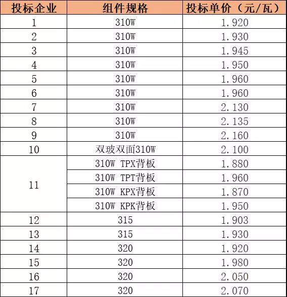 此次一共17家企業(yè)參與投標(biāo),從各家投標(biāo)的組件規(guī)格來看,本次投標(biāo)仍以310W高效單晶組件為主,少部分企業(yè)投報(bào)了更高功率的315W、320W組件,在評分時(shí)更高功率的組件是否存在一定的溢價(jià)目前尚不清楚。