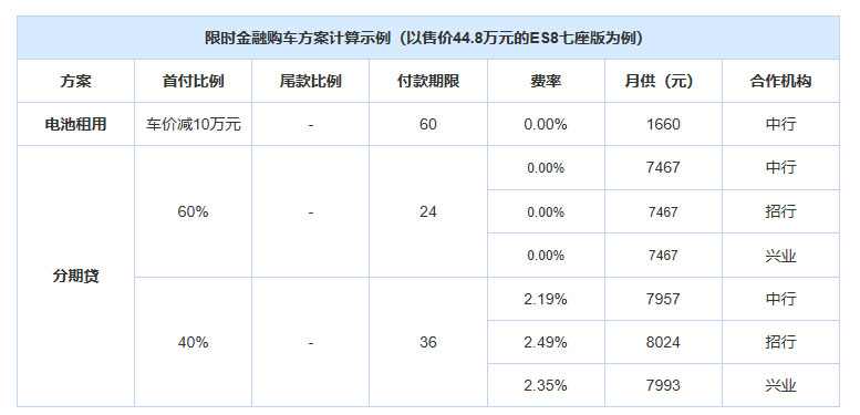 針對在2019年7月-9月提車的ES8、ES6首發(fā)紀(jì)念版/性能版用戶,蔚來汽車還提供了3種限時(shí)金融購車方案。第一種方案是:租用電池,車價(jià)立減10萬元,電池租用固定60期,月供為1660元。第二種方案為分期貸:首付60%即可享2年0利率,首付40%可享3年低利率。