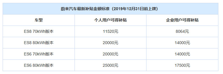 自2019年7月1日起,購買70kWh版本ES8并在2019年12月31日前上牌的個(gè)人用戶可享11520元補(bǔ)貼,企業(yè)用戶可享8064元補(bǔ)貼;購買84kWh版本ES8的個(gè)人用戶可享2萬元補(bǔ)貼,企業(yè)用戶可享1.4萬元補(bǔ)貼。同時(shí)2019年7月1日起,購買70kWh版本ES6并在2019年12月31日前上牌的個(gè)人用戶可享2萬元補(bǔ)貼,企業(yè)用戶可享1.4萬元補(bǔ)貼;購買84kWh版本ES6的個(gè)人用戶可享2.5萬元補(bǔ)貼,企業(yè)用戶可享1.75萬元補(bǔ)貼。