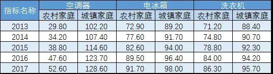 表1:每百戶家庭擁有耐用電器數(shù)(臺)
