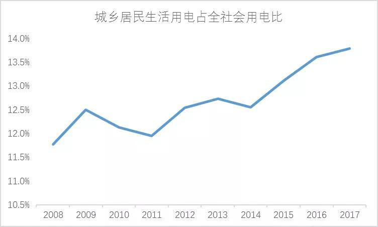雖然2017年居民用電占比僅為13.78%,但是城鄉(xiāng)居民生活用電總量不斷增加,對用電量增量貢獻也日益突出,2017 年居民用電同比增長 7.78%,而 2018 上半年加速至 13.20%,其增長持續(xù)高于同期整體用電量增速。