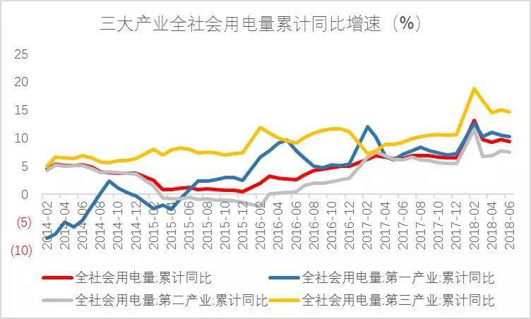 隨著我國經(jīng)濟結構的不斷調(diào)整,經(jīng)濟改革的不斷深化,高耗能產(chǎn)業(yè)的逐漸淘汰,我國產(chǎn)業(yè)結構不斷優(yōu)化升級,第三產(chǎn)業(yè)對經(jīng)濟發(fā)展的促進作用日益突出。從行業(yè)來看,第三產(chǎn)業(yè)全社會用電量累計同比增速明顯超出全社會用電總量的增速水平,而第二產(chǎn)業(yè)全社會用電總量累計同比增速在最近幾年基本上都低于整體增速,而且在2018年上半年,兩者差距進繼續(xù)擴大,表明產(chǎn)業(yè)結構進一步優(yōu)化升級。