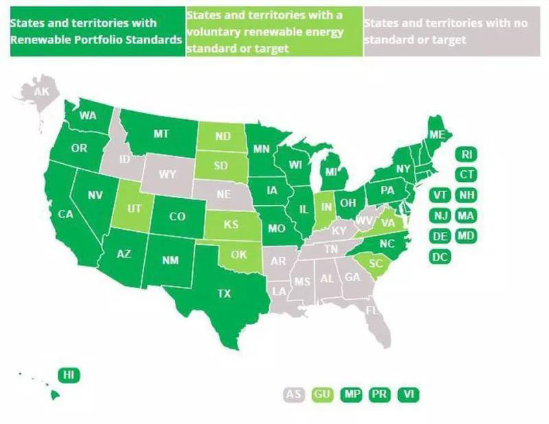 29個州加上華盛頓特區(qū),目前都制定了有約束力的可再生能源目標。8個州加上華盛頓特區(qū)制定了2017年以來100%清潔或可再生能源的目標。美國參議院提出立法規(guī)定2035年實現50%的可再生能源目標。