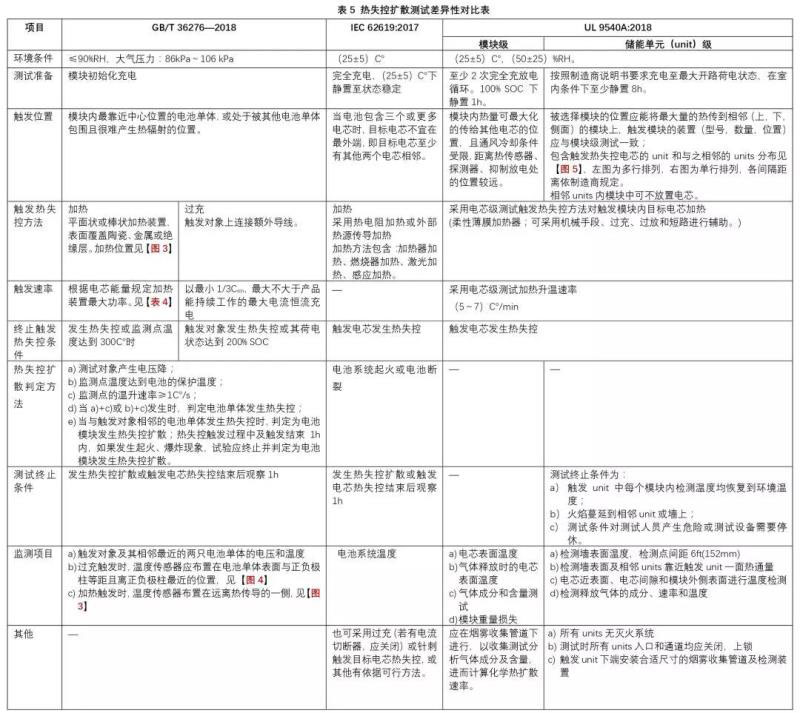 目前,包含儲(chǔ)能用電池?zé)崾Э財(cái)U(kuò)散要求和測(cè)試方法的相關(guān)標(biāo)準(zhǔn)有GB/T 36276—2018,IEC62619:2017,UL 9540A:2018。各標(biāo)準(zhǔn)應(yīng)用情境不盡相同,因此在技術(shù)要求,測(cè)試手段等方面存在差異,差異性匯總詳見(jiàn)表5所示▼
