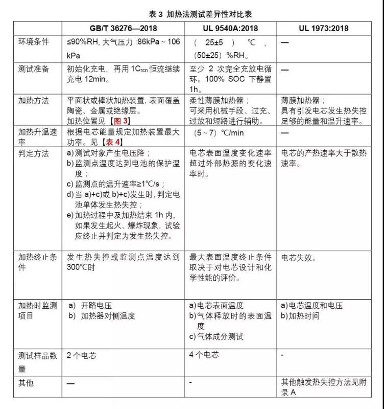 在GB/T36276—2018中,有關(guān)熱失控及熱失控?cái)U(kuò)散的觸發(fā)方法相對(duì)其他標(biāo)準(zhǔn)更少,通過(guò)規(guī)定較少的觸發(fā)方法限制了產(chǎn)品測(cè)試方案的選擇性,相對(duì)提升了產(chǎn)品通過(guò)測(cè)試的嚴(yán)苛性。