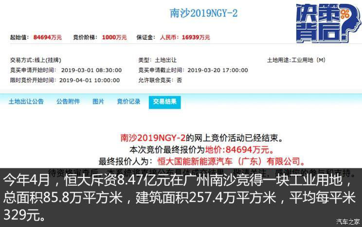 自從入局新能源汽車產(chǎn)業(yè)后,恒大進(jìn)一步加快了拿地速度。不僅工廠建設(shè)要用地,配套設(shè)施、上下游產(chǎn)業(yè)也要用地,恒大憑借汽車布局不斷地開疆拓土。以投資1600億于廣州南沙建設(shè)三大基地項(xiàng)目為例,就包括了要建成年產(chǎn)100萬輛整車的生產(chǎn)基地、50GWH生產(chǎn)規(guī)模的動力電池超級工廠、配套100萬輛整車的電機(jī)和電控系統(tǒng)生產(chǎn)基地。再舉個例子,4月17日,天津國能生活服務(wù)有限責(zé)任公司還以底價3.649億元、樓板價約2800元/平方米拿下天津?yàn)I海新區(qū)濱海科技園的一宗住宅、商服用地。資料顯示,該地位于天津?yàn)I海高新區(qū)濱??萍紙@內(nèi),即未來科技城的核心區(qū)。土地面積約為7.24萬平方米,規(guī)劃建筑面積約13.03萬平方米。
