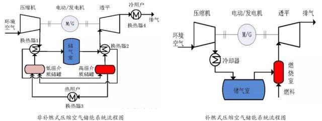 壓縮空氣儲能具有儲能密度大、存儲周期長、投資成本較少等優(yōu)點。按照運行方式的不同,壓縮空氣儲能系統(tǒng)可以分為補(bǔ)燃式和非補(bǔ)燃式兩大類(如圖)。