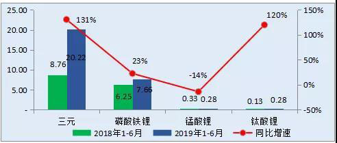 從不同電池類型來看,2019上半年三元電池裝機(jī)電量約20.22GWh,同比增長131%;磷酸鐵鋰電池裝機(jī)電量約7.66GWh,同比增長23%;錳酸鋰電池裝機(jī)電量約0.28GWh,同比下降14%;鈦酸鋰電池裝機(jī)電量約0.28GWh,同比增長120%,其余部分為未標(biāo)明具體類型的鋰離子電池。