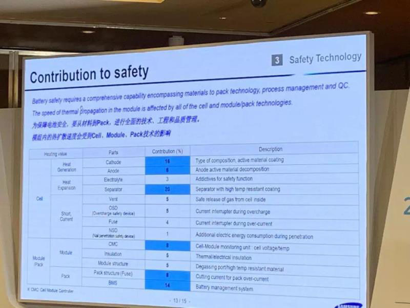 在動(dòng)力電池安全探索方面,三星SDI通過仿真試驗(yàn)做了詳細(xì)的數(shù)據(jù)跟蹤。按分類來看,影響最大的首先是隔膜,占20%;其次是正極材料,占16%;第三是BMS,占14%。