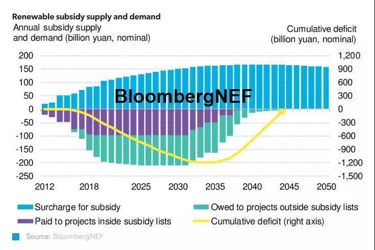 如果只考慮列入目錄的項(xiàng)目,補(bǔ)貼資金有望在3年內(nèi)能實(shí)現(xiàn)盈余。然而,據(jù)BNEF估算,如果將在目錄之外的項(xiàng)目也考慮在內(nèi),補(bǔ)貼缺口在今年年底將升至2280億元(332億美元)。到2035年,所有項(xiàng)目累計(jì)補(bǔ)助資金缺口將會(huì)擴(kuò)大至1.4萬億元(約2030億美元),隨后逐漸減小。