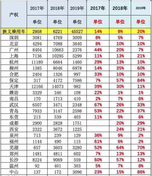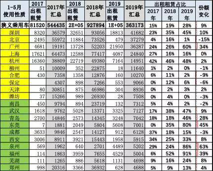 北京由于6萬指標(biāo)限制,沒有持續(xù)放號,指標(biāo)缺乏,因此19年5月北京銷量增表現(xiàn)一般。貴陽、廈門、福州等的出租租賃比例較強。