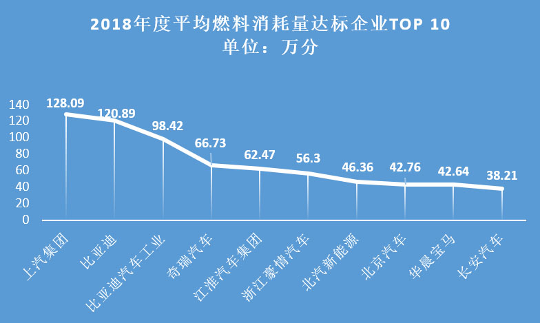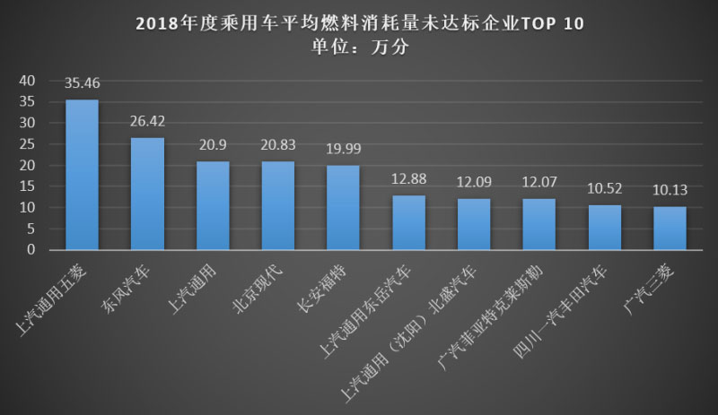 從上述圖表中可發(fā)現(xiàn),排名前十的平均燃料消耗量未達(dá)標(biāo)企業(yè)負(fù)積分累計(jì)達(dá)191.12萬(wàn)分,占平均燃料消耗量負(fù)積分比超60%。