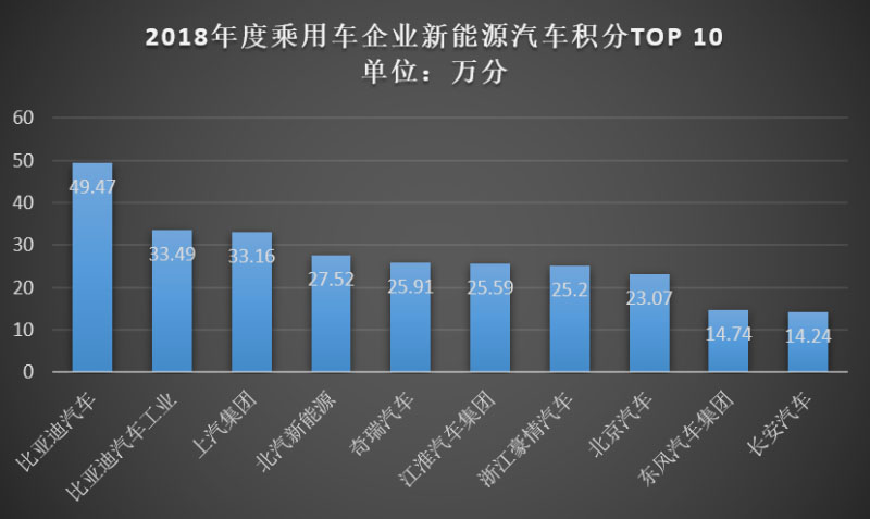 從上述數(shù)據(jù)來(lái)看,排名前十企業(yè)的新能源汽車積分累計(jì)約為272.39萬(wàn)分,占2018年新能源乘用車積分的比例近70%。其中,比亞迪、上汽集團(tuán)、北汽新能源成大贏家。