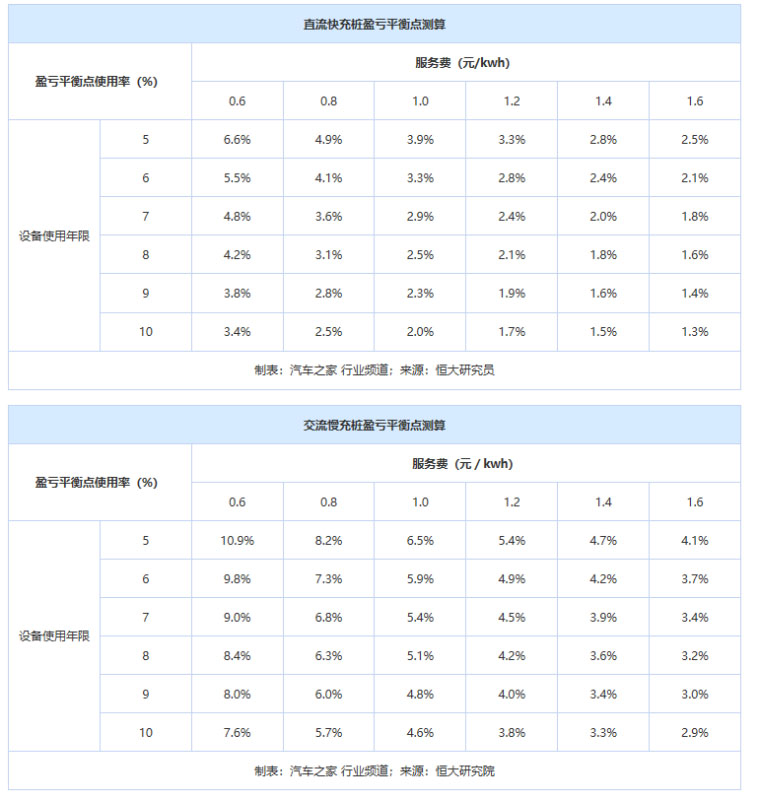 那么到怎樣的使用頻次,公共樁可以賺錢呢?恒大研究院針對直流快充樁和交流慢充樁,分別做了如下表所示的模型測算: