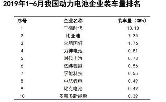 2019年1-6月,我國新能源汽車市場共計63家動力電池企業(yè)實現(xiàn)裝車配套,排名前3家、前5家、前10家動力電池企業(yè)動力電池裝車量分別為22.2GWh、23.8GWh和26.2GWh,占總裝車量比分別為74.1%、79.2%和87.5%。