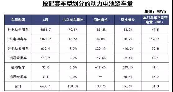 2019年6月,我國動力電池裝車量數(shù)據(jù)顯示,我國動力電池裝車量共計6.6GWh,同比增長130.7%,環(huán)比增長16.6%,同環(huán)比增速均較5月份稍有提升;三元電池6月份裝車量共計4.7GWh,環(huán)比增長27.0%,再次實現(xiàn)正增長,磷酸鐵鋰電池在專用車領域配套量較5月份稍有下降,6月裝車量1.7GWh,環(huán)比下降2.9%。