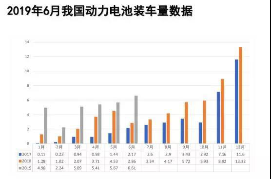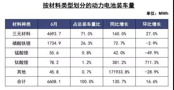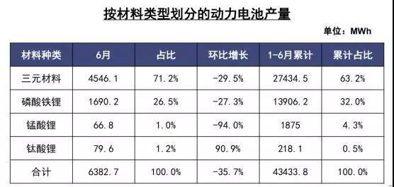 從2019年6月動力電池產量數(shù)據(jù)來看,我國動力電池產量共計6.4GWh,環(huán)比下降35.7%。其中三元電池產量4.5GWh,環(huán)比下降29.5%,占總產量比71.2%;磷酸鐵鋰電池產量1.7GWh,環(huán)比下降27.3%,占總產量比26.5%。
