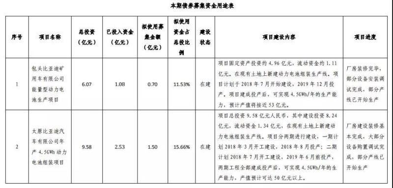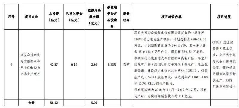 其中,50%的募集資金擬用于包頭比亞迪礦用車有限公司能量型動力電池生產(chǎn)項目,太原比亞迪汽車有限公司年產(chǎn)4.5GWh動力電池組裝項目和西安眾迪鋰電池有限公司年產(chǎn)10GWh動力電池生產(chǎn)項目,剩余50%的募集資金擬用于補充公司流動資金。