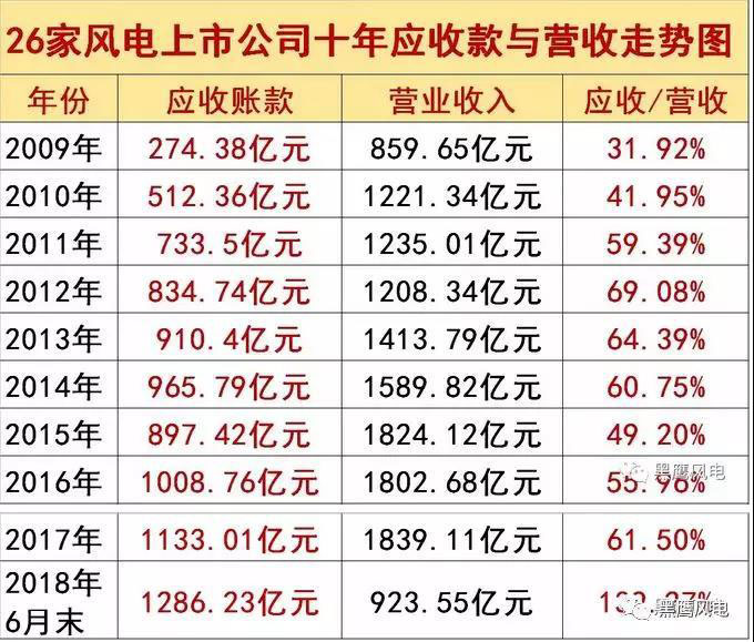 規(guī)模還在快速增長!截至2018年6月末26家風(fēng)電上市公司應(yīng)收賬款及票據(jù)較2017年底又增長了153.22億元,至1286.23億元,占營業(yè)收入比重竟然達到了139.27%。即便是年營收破百億的風(fēng)電巨頭也面臨著巨大的應(yīng)收賬款壓力及風(fēng)險。據(jù)黑鷹風(fēng)電統(tǒng)計,截至2017年末,金風(fēng)科技、國電科環(huán)、湘電股份、龍源電力等9大營收過百億元的風(fēng)電巨頭應(yīng)收賬款及應(yīng)收票據(jù)規(guī)模合計達744.16億元,占整體規(guī)模的比重達65.68%。此外,26家風(fēng)電上市公司年度應(yīng)收賬款及票據(jù)規(guī)模一直是同期這些公司凈利潤總和的3-22倍。這樣的數(shù)據(jù)對于企業(yè)運營意味著什么,相信大家都懂。