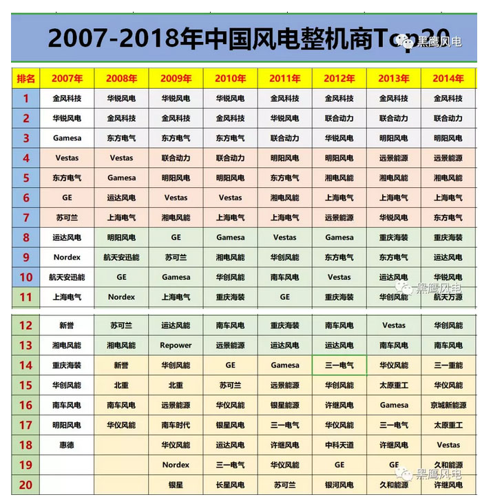 要跨越十五年的時間周期,理清整個中國風(fēng)電行業(yè)的競爭變局,細枝末節(jié)已極難說清。當(dāng)我們從歷年風(fēng)電整機商的具體排名變化,基本可以看到中國風(fēng)電市場競爭格局、趨勢的大變化,如下表: