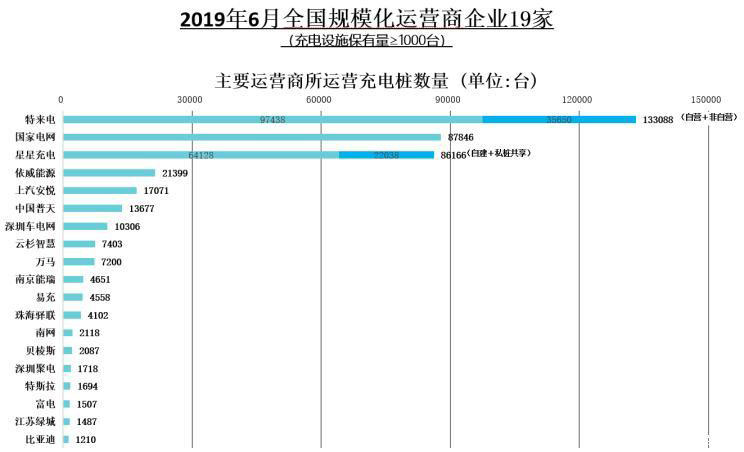 與上月相似,從運營商角度來看,集中度也較高。截止到2019年6月,全國充電運營企業(yè)所運營充電樁數(shù)量超過1萬臺的共有7家,分別為:特來電運營13.3萬臺、國網(wǎng)運營8.8萬臺、星星充電運營8.6萬臺、依威能源運營2.1萬臺、上汽安悅運營1.7萬臺、中國普天運營1.4萬臺、深圳車電網(wǎng)運營1.0萬臺。這7家運營商占總量的89.8%,其余的運營商占總量的10.2%。