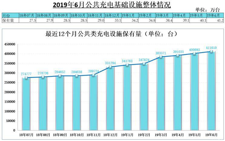 充電樁布局正在加速。7月10日,中國電動充電基礎(chǔ)設(shè)施促進聯(lián)盟發(fā)布數(shù)據(jù)顯示,截至2019年6月,聯(lián)盟內(nèi)成員單位總計上報公共類充電樁41.2萬臺,其中交流充電樁23.6萬臺、直流充電樁17.5萬臺、交直流一體充電樁0.05萬臺。2019年6月較2019年5月公共類充電樁增加10926臺。從2018年7月到2019年6月,月均新增公共類充電樁約11656臺,2019年6月同比增長51.5%。