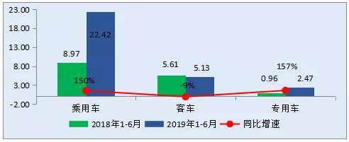 從車輛細(xì)分類別來看,2019上半年新能源乘用車電池裝機(jī)電量約22.42GWh,同比增長150%;客車電池裝機(jī)電量約5.13GWh,同比下降9%;專用車電池裝機(jī)電量約2.47GWh,同比增幅最大,高達(dá)157%。