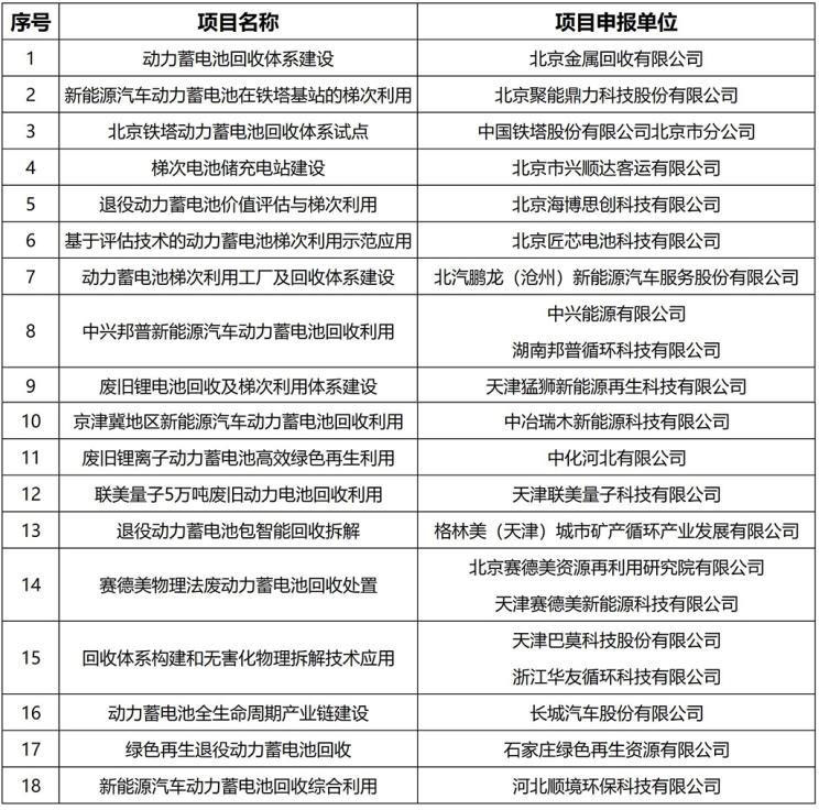 隨著新能源汽車推廣量不斷增加,動(dòng)力電池回收正在變得越來越迫切。近日,北京、天津、河北共同組織開展了,京津冀地區(qū)新能源汽車動(dòng)力電池回收利用試點(diǎn)示范項(xiàng)目的遴選,共有18個(gè)動(dòng)力電池回收及再利用項(xiàng)目入選。